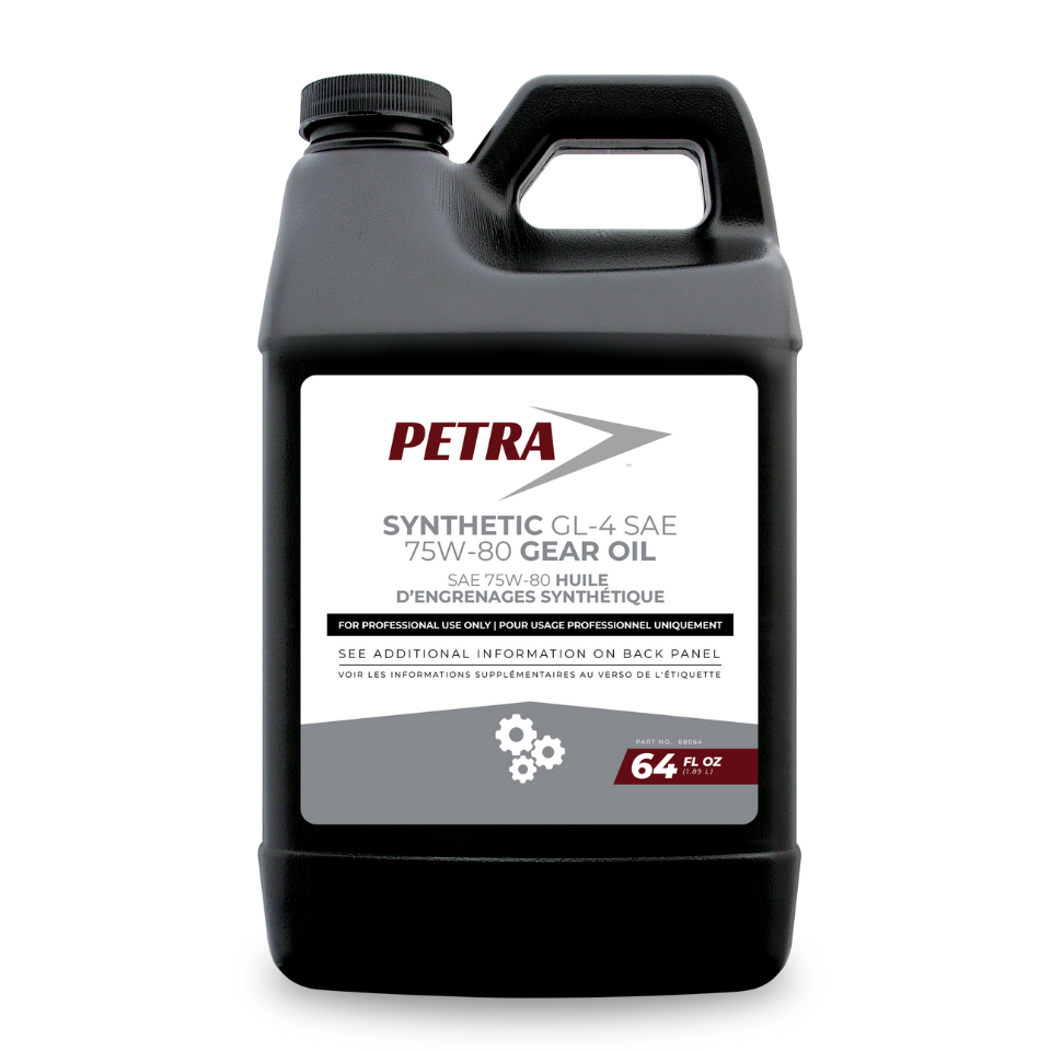 Petra™ SAE 75W-80 Synthetic Gear Oil, API GL-4 is a high-performance synthetic GL-4 gear oil designed for both transfer case and manual transmission applications which specify an SAE 75W80 grade fluid API GL-4 gear oil. It is formulated on high-quality synthetic base oils and utilizes a shear-stable viscosity modifier as well as robust Extreme Pressure and Antiwear additives to provide maximum protection to gears and bearings. It is based on thermally-stable additive technology to prevent deposits that could lead to seal leakage.
