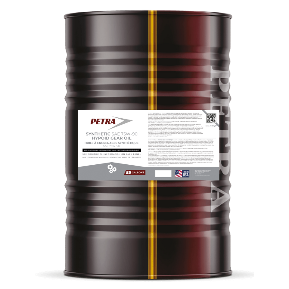 Petra™ Synthetic 75W-90 gear oil combines a premium performance additive package with a high quality synthetic base stock. It is specifically formulated for use in passenger cars, light duty trucks, heavy duty trucks, farm tractors, earthmoving construction, differentials, steering gears requiring a hypoid and other heavy duty equipment. They meet the requirements of: API GL-5, MAN 342N, SAE J306b, ZF TE-ML 05A, US Military, MIL-L-2105 C and D, 75W, TE-ML 12E, AGMA 9005 E 02, U.S. STEEL 224, DIN 51527 Part 3 and David Brown S1.53.101.