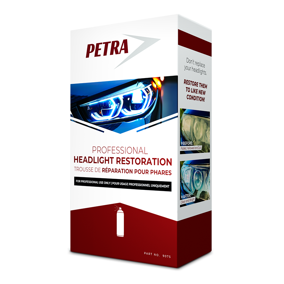 Petra™ Professional Headlight Restoration kit will service one vehicle (2 headlights) with no tools or buffing needed. This kit was designed to address all of the short comings in the headlight restoration category, and the formula has been third party lab tested for longevity. It will restore polycarbonate headlights to a like new condition with minimal steps, in 20 minutes or less.