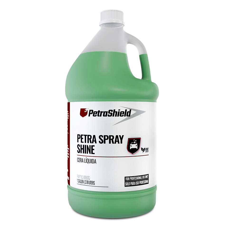 Petra Shine is a ready to use spray on and wipe off liquid wax. It removes dirt, finger prints, and smudges while enhancing the gloss of showroom vehicles.