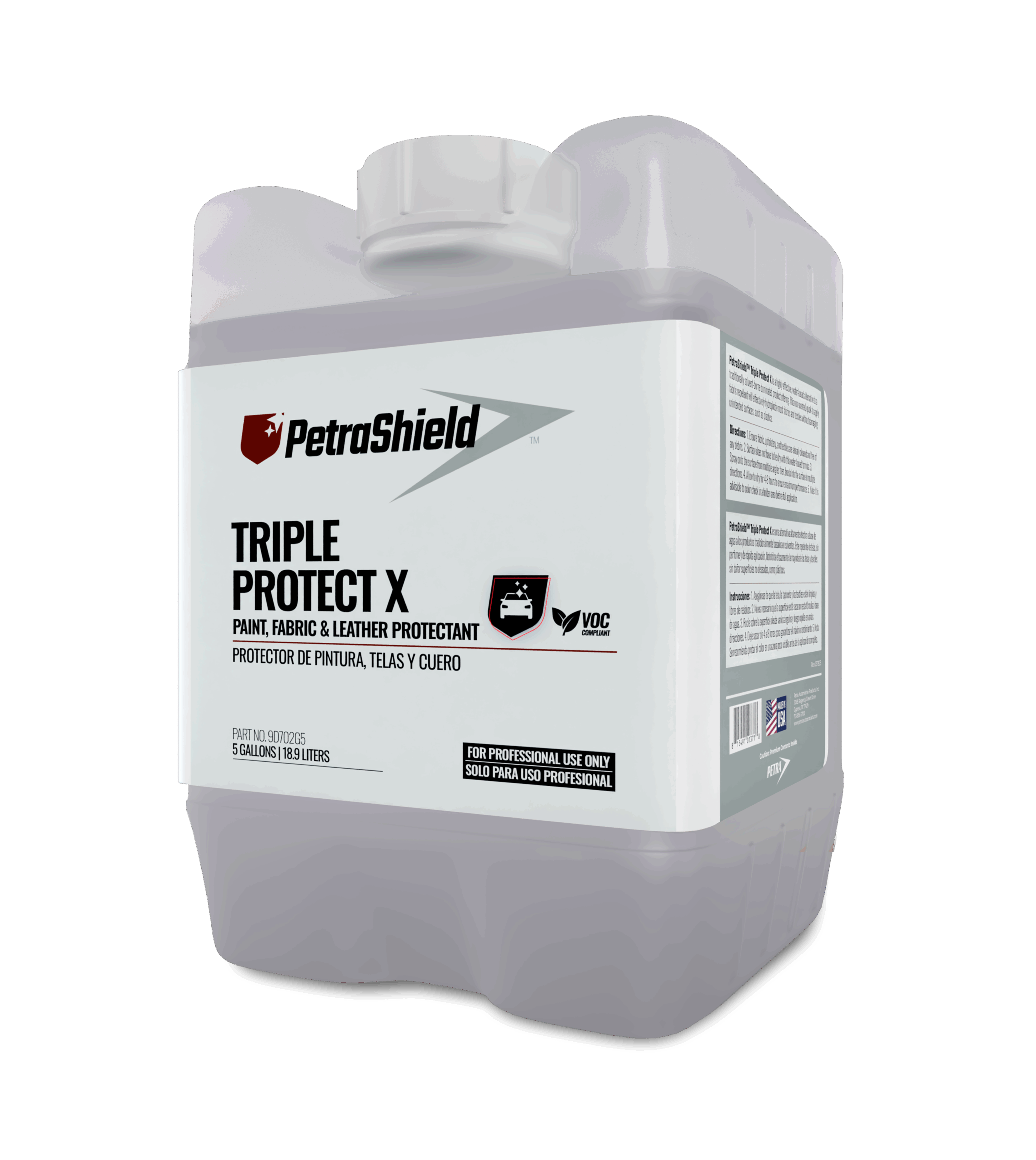 PetraShield™ Triple Protect X is a highly effective, water-based alternative to a traditionally solvent-borne dominated product offering. This non-scented, quick-to-apply fabric repellent will effectively hydrophobe most fabrics and textiles without damaging unintended surfaces, such as plastics.